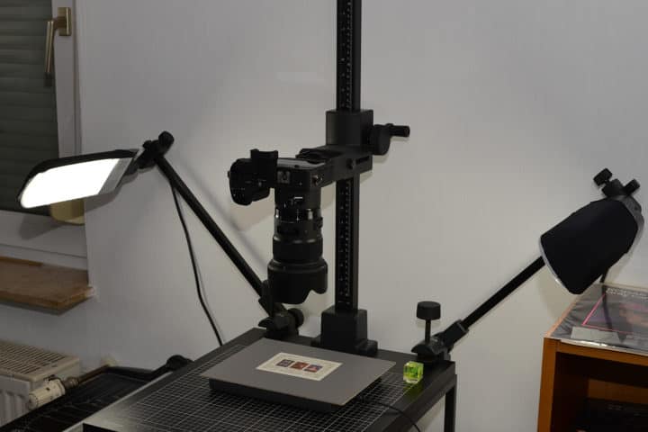Die Briefmarken liegen auf einer Kodak-Graukarte, die ich vorsichtig zurechtschiebe, bis die Abstände zu den Rändern stimmen.
