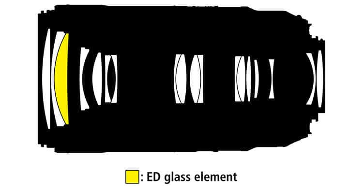 Das optische System besteht aus 18 Linsen in 14 Gruppen. Eine Linse besteht aus ED-Glas.