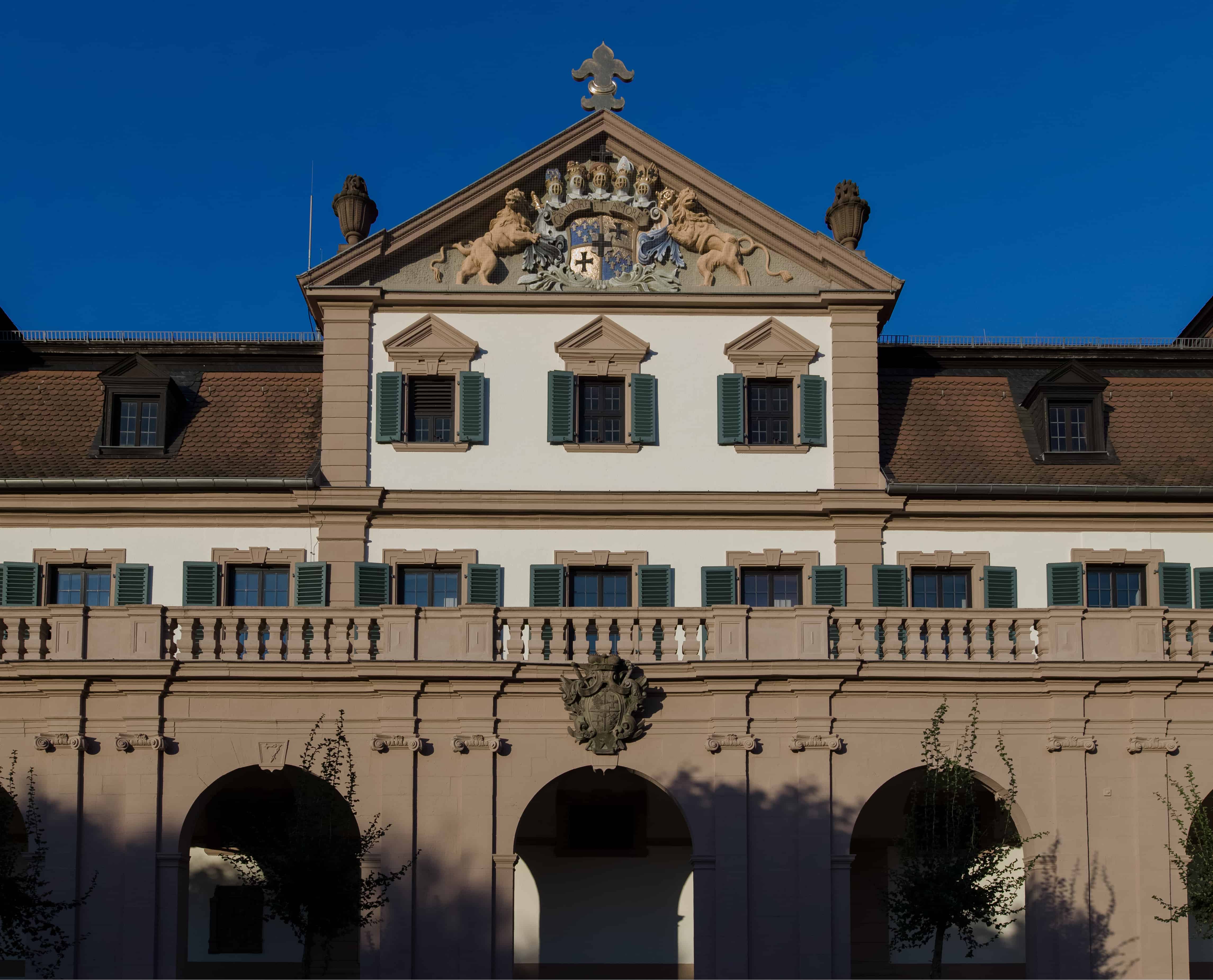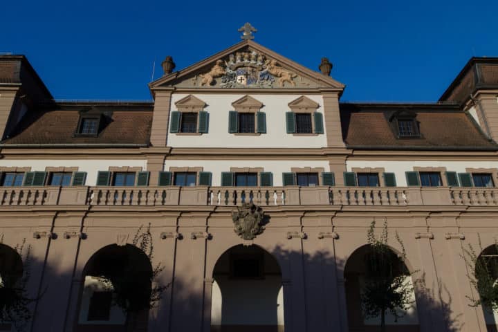 Dort angekommen suche ich erst einmal einen Platz, von dem aus die südwestliche Front umgeben von Bäumen ins Bild gerückt wird. Schon die Aufnahmen mit Blende 2 sind fabelhaft, aber mit Blende 8 bekomme ich die ganze Fassade in die Schärfe. Auf dem Rechner in der Redaktion sehe dann, dass selbst die feinen Drähte der Taubenabwehr vor dem Wappen aufgelöst werden.