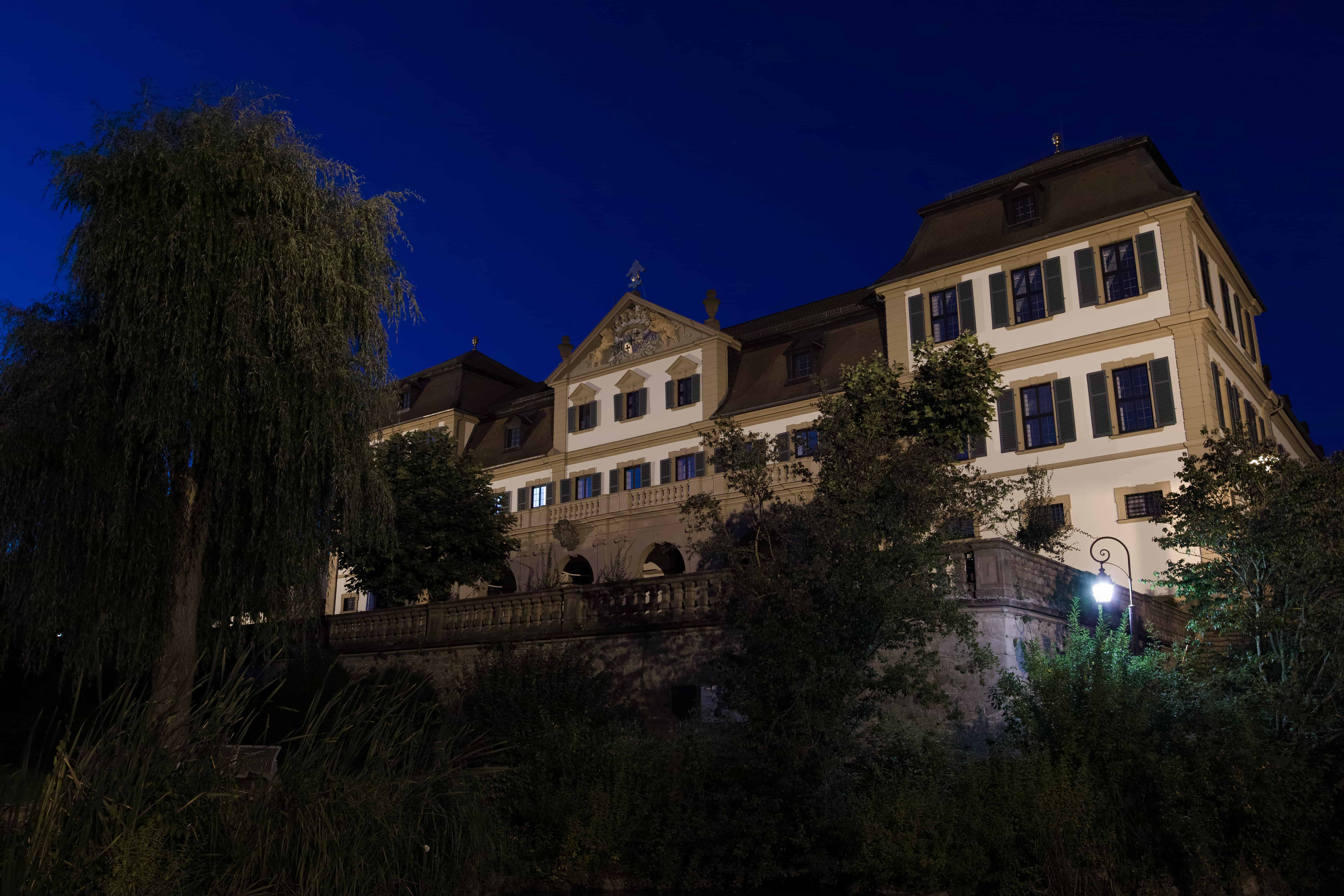 Die ersten Aufnahmen wurden am späten Nachmittagen gemacht. Nach Einbruch der Dunkelheit mache ich mich noch einmal auf den Weg (das Tiltall TC-284 hat Carbon-Beine und wiegt freundicherweise nicht viel), finde den Standort vom Nachmittag ziemlich gut wieder – und kann nun ein rotes Schloss fotografieren, das ganz anders wirkt.