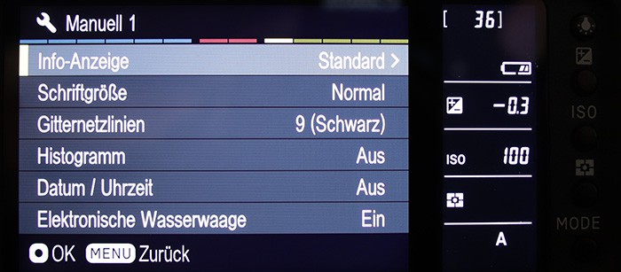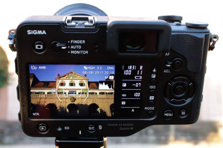 Bei allen Aufnahmen ist es wichtig, die Kamera gerade zu halten, bei Architekturaufnahmen ist es sehr wichtig. Daher habe ich bei der sd Quattro H ein Gitterraster und die Wasserwaage ins Sucherbild einblenden lassen. Beide Hilfsmittel können im ersten Menüpunkt des Einstellmenüs unter „Monitor Modus-Einstellungen“ aktiviert werden. Man kann sie auch im Sucher anzeigen lassen („Sucher Modus-Einstellungen“).