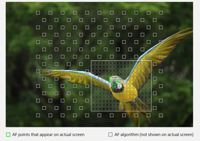 Für die Scharfstellung des wuchtigen Objektivs sorgt ein Fast-Hybrid-AF-System mit 315 AF-Punkten. Es werden rund 65% des Bildfeldes abgedeckt. Die AF-Geschwindigkeit wurde bereits angesprochen. Um bei der Schärfennachführung bessere Ergebnisse zu bringen, werden AF-Feld-Cluster-gebildet. Diese Technik ist aus einigen Kameras der A-Serie bekannt. Selbst spontane Richtungsänderungen des Motivs sollen dadurch keine Probleme mehr verursachen. Ebenfalls bekannt ist, dass der Autofokus die Schärfe auf die Augen einer Person legen kann.