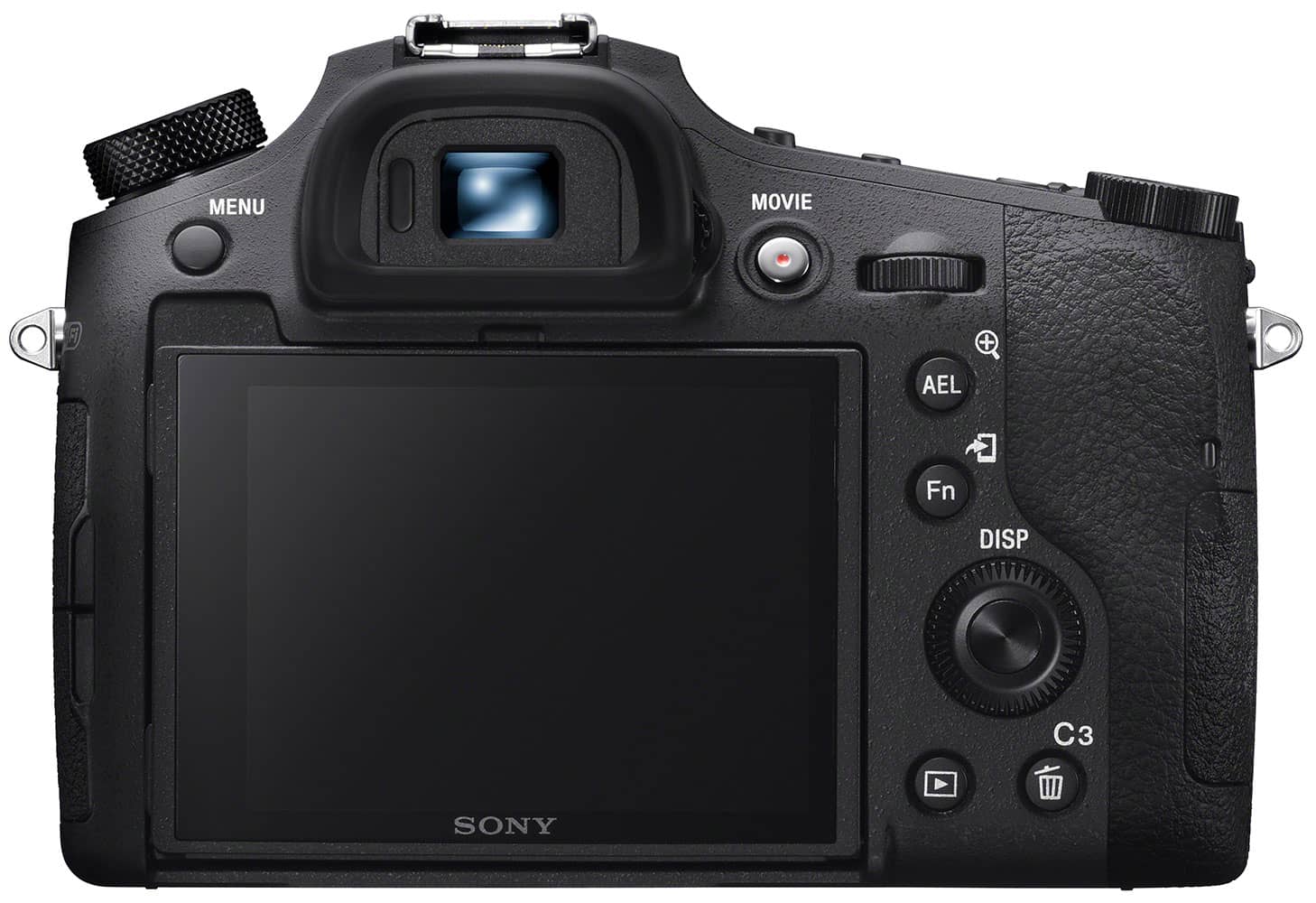 Die Sony RX10 IV ist eine typische All-in-One-Kamera. Ihr Design orientiert sich an einer DSLR. Unter dem Sucherbuckel ist aber kein optischer Sucher, sondern ein EVF zu finden. (Und ein Blitz.) Der OLED-Monitor hier löst mit 2,35 Mio Dots auf.