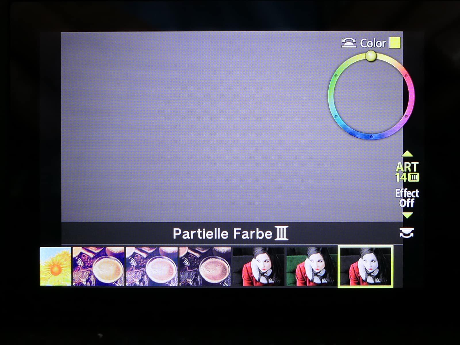 Wenn das Kreativ-Einstellrad auf „A“ steht, drückt man den kleinen Hebel unter dem Betriebsartenwählrad nach rechts und kann nun durch 28 ART-Filter scrollen.