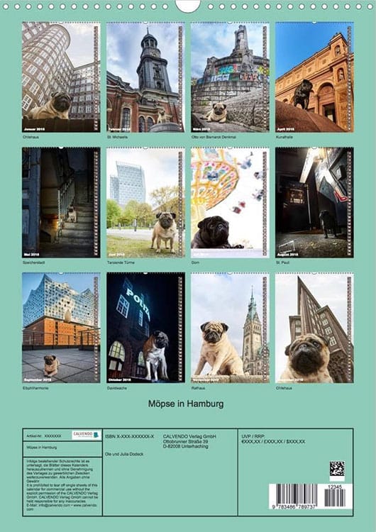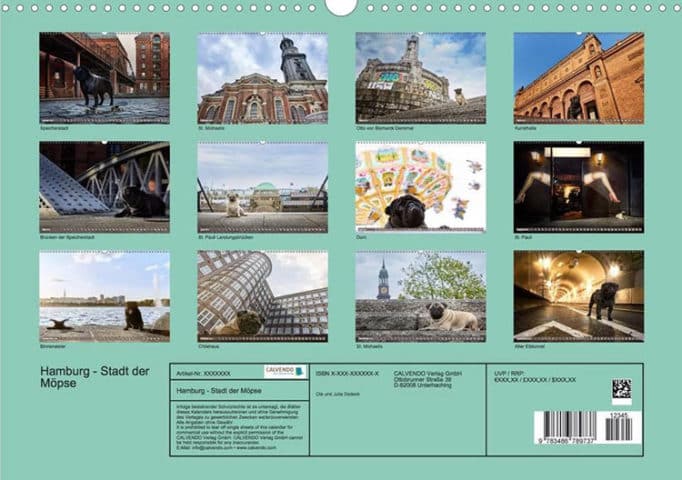 Die Kalender Möpse in Hamburg (Hochformat) und Hamburg – Stadt der Möpse (Querformat) sind jeweils in vier Größen (A5 bis A2) im Calvendo Verlag erschienen.