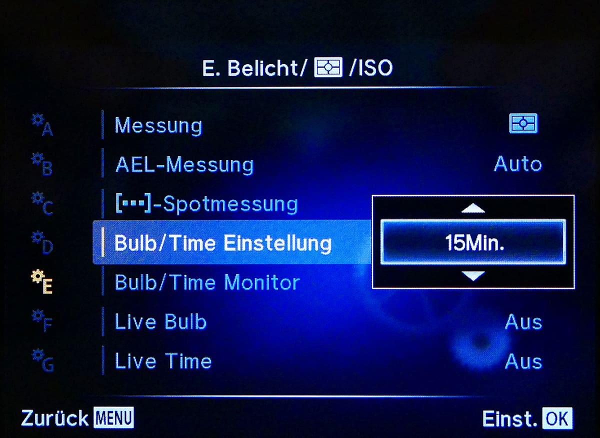 Sowohl für die Bulb- wie auch für die Time-Einstellung kann man festlegen, wie lang die Belichtung maximal dauern soll!