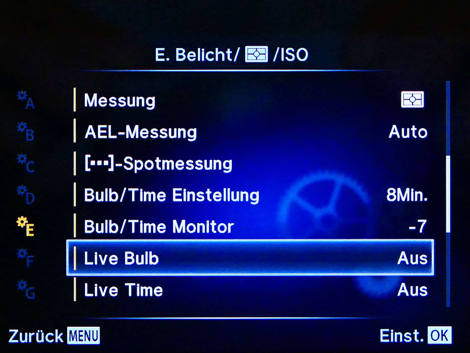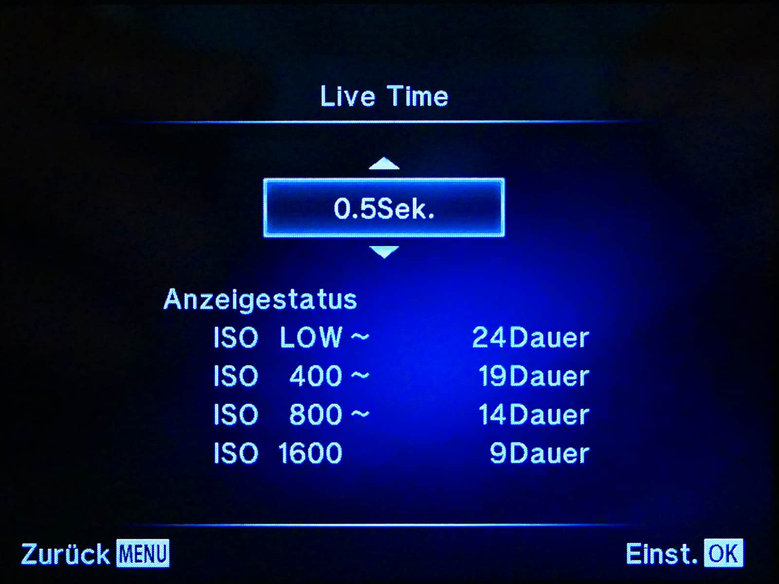 - Verschlusszeitenreihe bis 60 Sek. durchlaufen, dann folgen Bulb, Live Time und Live Composite