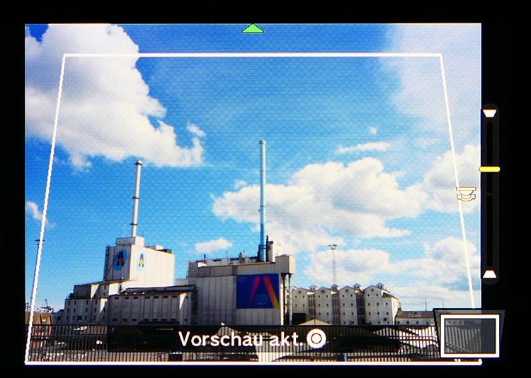 Dafür wird über das geöffnete Bild ein Rechteck gelegt, das man mit den beiden Einstellrädern der PEN-F zu einem Trapez verzerren kann. Wenn die Linien des Trapezes an den stürzenden Linien anliegen, werden die dann senkrecht oder waagrecht ins Bild gebracht.