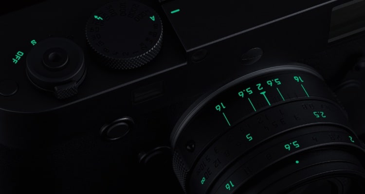 Der Clou ist im Grunde genommen ganz einfach, denn auf den ersten Blick wird sämtliche Farbe weggelassen. Wie der Name schon vermuten lässt, erstrahlt die Kamera in Schwarz. Das ändert sich erst dann, wenn das Licht ausgeschaltet wird, denn die wichtigsten Einstellelemente von Kamera und Objektiv sind mit einem fluoreszierenden Lack versehen, wie man ihn beispielsweise auch vom Zifferblatt einer Uhr kennt.