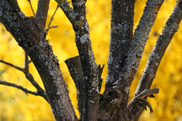 Wenn es beim Spielen mit der selektiven Schärfe einen Punkt gibt, der den Blick einfängt, wie etwa der Wassertropfen im Bild der Forsythie, kann man auch mal wagen, Vorder- und Hintergrund in einer Farbe zu halten.