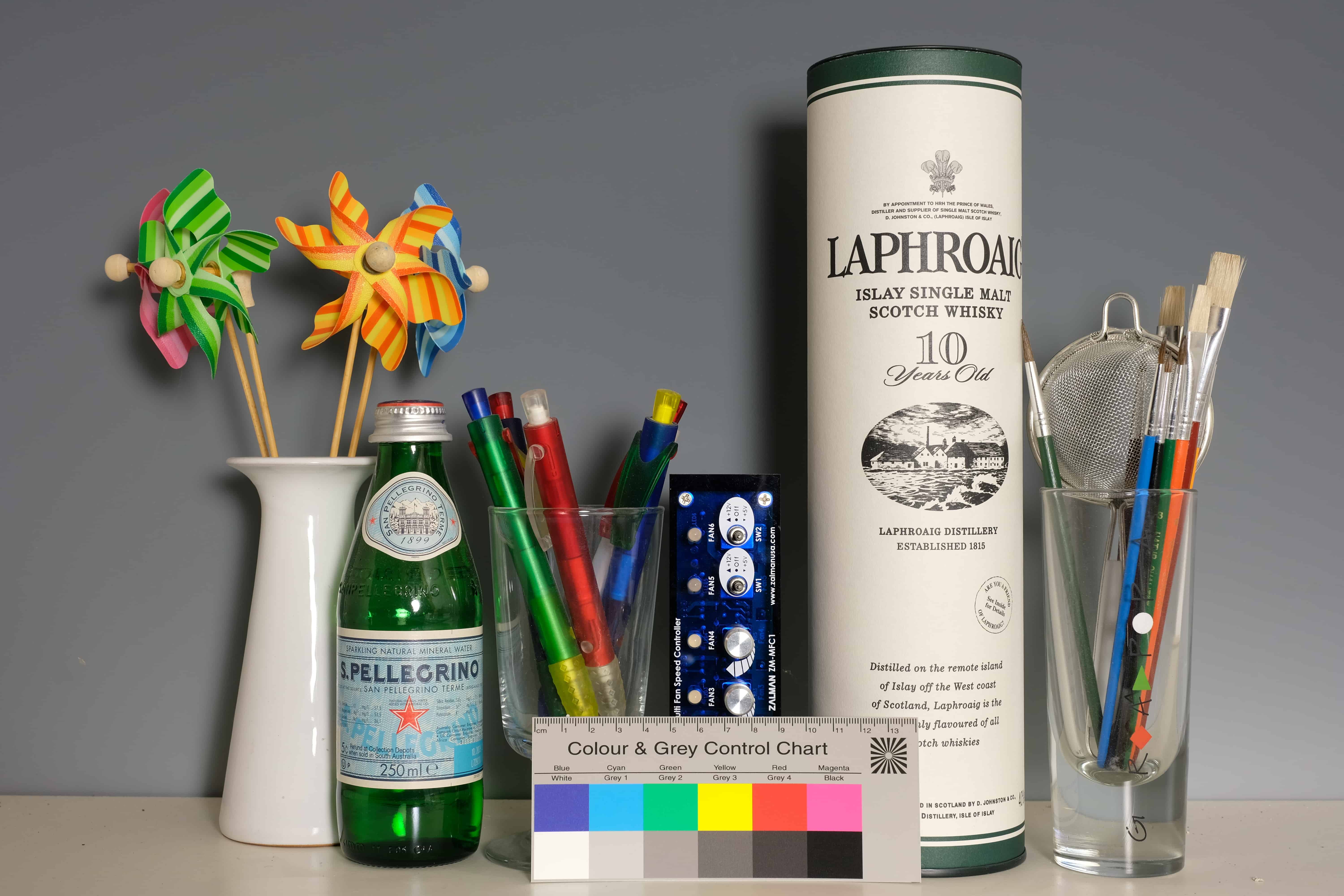 Für die ISO-Reihe wird unser Standardmotiv (ab jetzt ergänzt durch ein Sieb) im Studio mit einer Tageslichtleuchte beleuchtet. Der Weißabgleich erfolgt automatisch, die Belichtung mit Zeitautomatik. Die Kamera steht auf einem alten, aber sehr stabilen Cullmann Titan-Stativ. Die Entfernung zum Motiv ist so, dass es mit einer Brennweite von 50 mm [@KB] ganz erfasst wird. Kleine Unterschiede im Bildausschnitt kommen von Einstellunsicherheiten, wenn ein Zoom für die Aufnahme verwendet wird.