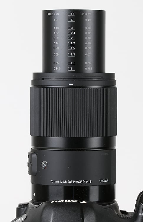 Auf dem schlanken Tubus, der sich nach vorn schiebt, sind 10 Abbildungsmaßstäbe von 1:10 bis 1:1 aufgetragen und dazu die entsprechenden Entfernungen in Meter und Feet. 1:10 erreicht man aus einer Entfernung von 82 cm, 1:2 aus 30 cm und 1:1 aus 25,8 cm.