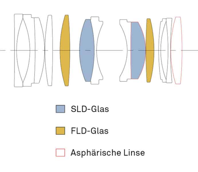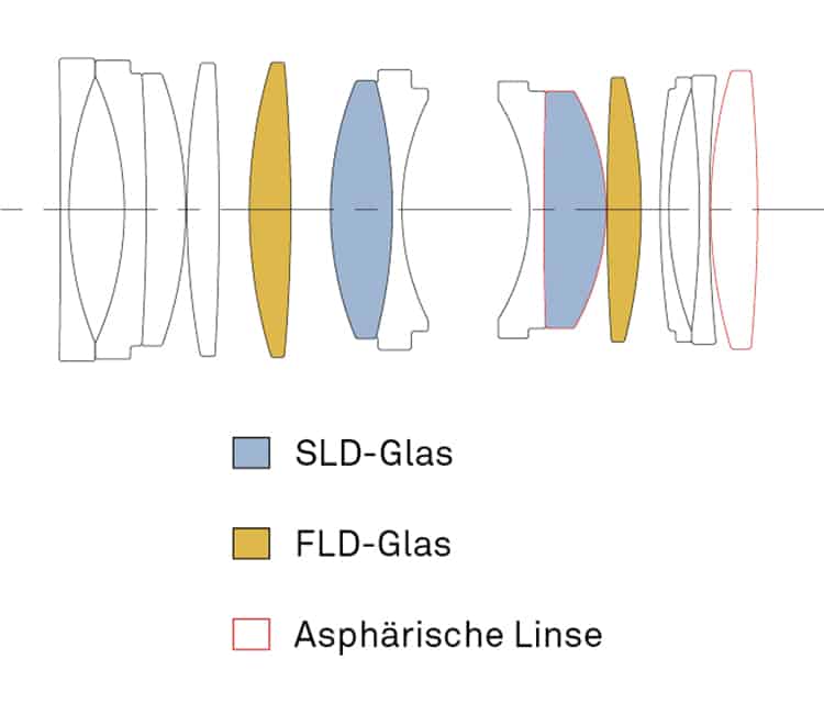 Im Inneren des Objektiv sind 13 Linsen in 10 Gruppen verbaut. Von diesen Linsen bestehen fünf aus besonderen Gläsern, um Farblängsfehler zu minimieren, was für die Abbildungsleistung … aber dazu gleich mehr.