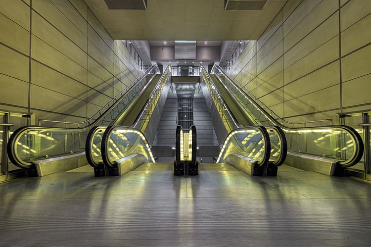 Die Treppe zu nehmen, ist zwar gesünder, mit der Rolltreppe oder dem Laufband zu fahren aber deutlich bequemer. Viele Rolltreppen haben zudem den Vorteil, ein sehenswertes Motiv zu sein. Besonders die streng symmetrisch angelegten Systeme haben ihren Reiz und sollten dann auch streng symmetrisch ins Bild gesetzt werden, obwohl ja der mittige Bildaufbau in der Regel verpönt ist. Wer eine Rolltreppe ohne Menschen fotografieren möchte, braucht Geduld oder muss wissen, wann nicht so viel los ist. Mit Stativ und einer langen Verschlusszeit kann man das Gewimmel an einer Rolltreppe auch ins Motiv einbeziehen. Allerdings sollte man in diesem Fall feststellen, ob man fürs Fotografieren mit Stativ die Einwilligung des Hausherrn braucht. Die Einstellung des Weißabgleichs auf Tageslicht bringt die Effekte des vorherrschenden Lichts ins Bild.