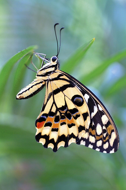 Die fotogenen Insekten werden gern fotografiert, wenn sie mit weit geöffneten Flügeln irgendwo sitzen. Allerdings ist dabei der Hinter- oder besser Untergrund meist sehr nah und drängt sich störend mit ins Bild. Wenn man den Schmetterling dagegen mit zusammengeklappten Flügeln von der Seite aufnimmt, wird der Hintergrund eher unscharf, besonders mit einer langer Brennweite. Sie hat gleich noch den Vorteil, dass man dem Tier nicht zu nahe kommt und sich dadurch die Gelegenheit verschafft, mehrere Bilder machen zu können. Gerade, wenn der Hintergrund recht weit weg ist, muss man nicht unbedingt Blende 2,8 oder größer verwenden – auch mit Blende 4 oder 5,6 kann man ihn in die Unschärfe schubsen. Im Bild ein Limettenschwalbenschwanz.