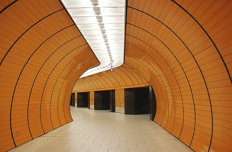 Es gibt einige U-Bahn-Stationen, die bei Fotografen sozusagen Kultstatus genießen, weil sie sich etwa mit halbkugeligen Lampen über den Bahnsteigen oder mit bunten Wänden als Motive anbieten. Auch wenn der ein oder andere sagt, solche Bilder seien abgedroschen: Trotzdem fotografieren! Aber auch der Weg zum Bahnsteig führt mitunter durch fotogene Zonen der Unterwelt. Wer zur Rushhour dort fotografieren möchte, sollte statt des sperrigen Dreibein- ein schlankes Einbeinstativ verwenden und ggf. den ISO-Wert um eine oder zwei Stufen höher verwenden. Ansonsten hiflt auch hier Geduld und zur richtigen Zeit vor Ort zu sein. Auch eine Serie mit nur minimalen Unterschieden im Bildausschnitt kann zum Bild ohne Personen verhelfen. Per Software (ich kenne es Photoshop Elements) kann man dann „personenlose“ Bildpartien aus dem einen Bild in das andere übertragen und dort störende Personen überdecken. Der manuelle Weißabgleich auf eine kleine Karte ist wegen der Leuchtstoffröhren zu empfehlen.