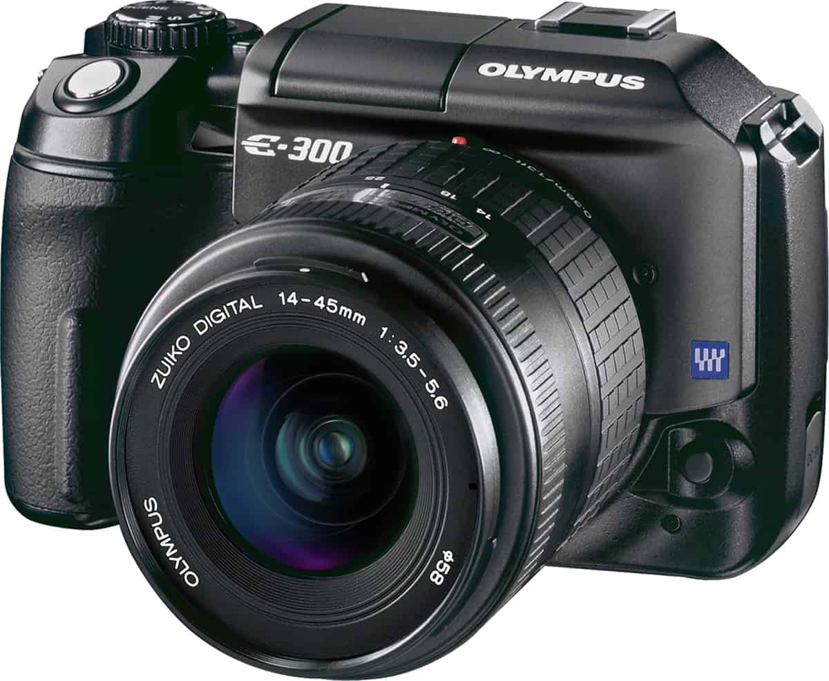 Auch Olympus ist mit zwei Kameras in der Foto Zeitung 4/2005 vertreten – die beide zwar einen FourThirds-Sensor aufweisen, aber noch als DSLRs ausgeführt sind. Die Olympus E-1 erinnert dabei an eine klassische DSLR mit Sucherbuckel, während sich die Olympus E-300 am Design einer Messsucherkamera orientiert und mit ihrem „Flachdach“ die Foto-Fans polarisiert.