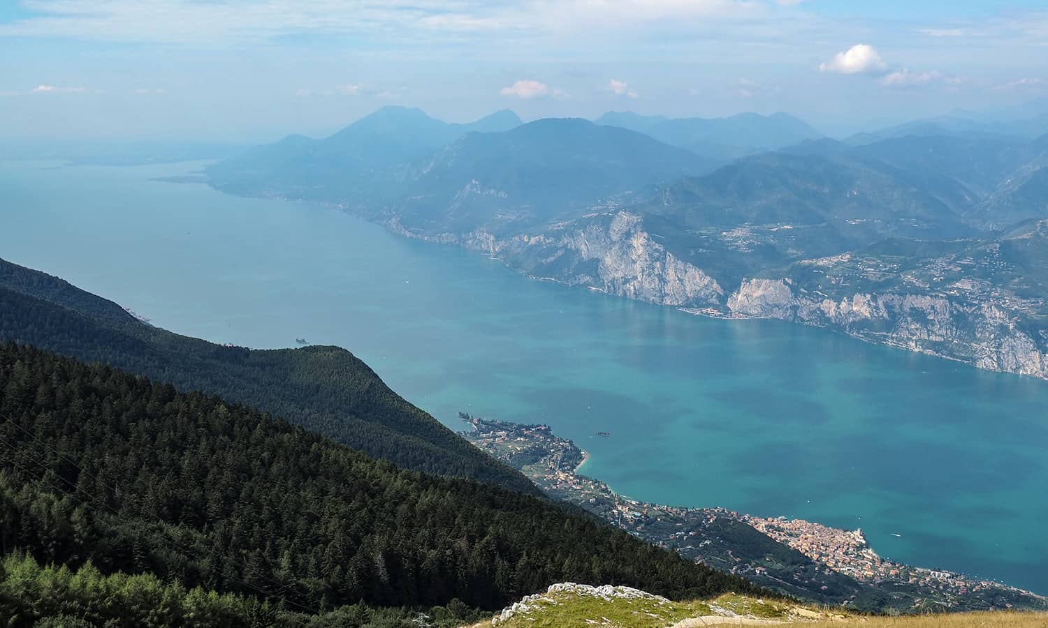 Auf dem Monte Baldo entstand das Aufmacherbild über Malcesine – der Blick geht nach Süden. Ein Problem, das man beim Fotografieren an großen Seen im Sommer hat wird sichtbar: Es ist sehr dunstig und das typische Verblauen der Landschaft in der Ferne setzt schon recht bald ein!