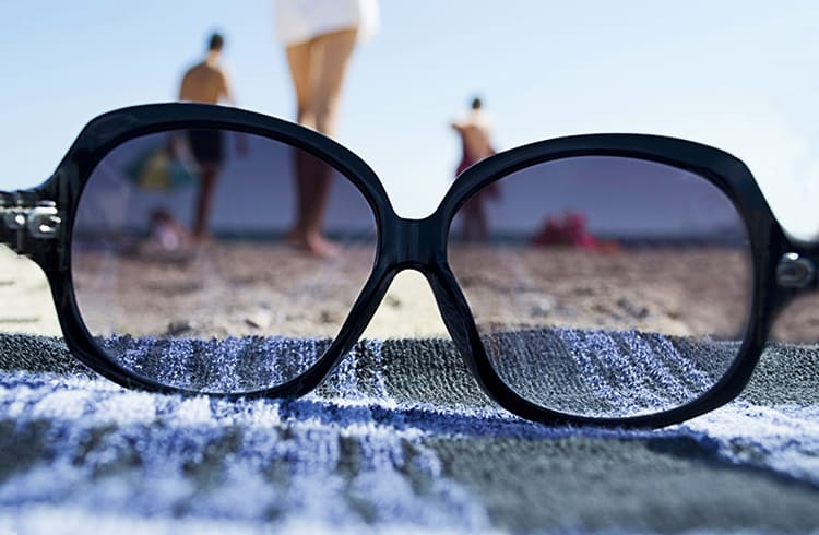 Am Strand liegen und dösen ist ja schön und gut, aber irgendwann wird es langweilig und es kribbelt im Auslösefinger. Gut, wenn man eine Kamera dabei hat, besser, wenn man eine Kamera dabei hat, die einen schwenkbaren Monitor aufweist, denn dann kann man die Sonnenbrille, die auf dem Badetuch liegt bequem aufnehmen. Sie erzeugt durch ihren Doppelrahmen einen pfiffigen Touch, unterstrichen durch die partielle Abdunkelung. Wenn man mit einer großen Blende arbeiten kann, bringt der Übergang von schmaler Schärfenzone im Vordergrund zur Unschärfe im Hintergrund Tiefe ins Bild. Eine leichte Minuskorrektur sorgt dafür, dass dunklen Gläser noch ein bisschen knackiger wirken.