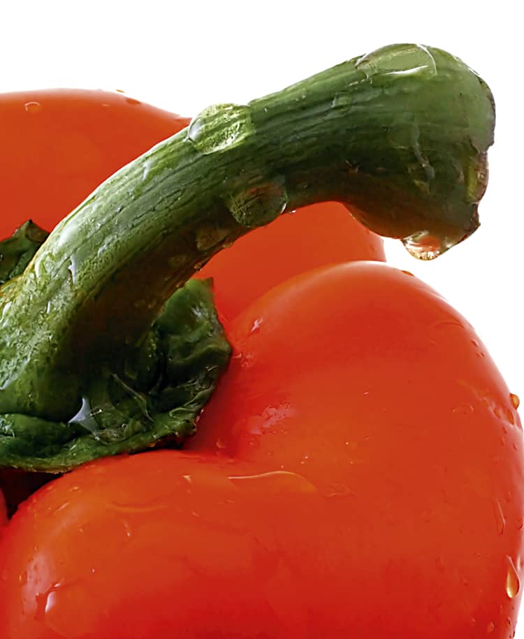 Mit dem Essen spielt man nicht – aber man kann es erst fotografieren und dann seiner eigentlichen Bestimmung zuführen. Zu den beliebten Motiven in der Küche zählen Zitronen und Orangen, gern auch in dünnen Scheiben auf einer Leuchtplatte. Aber auch Paprika ist sehr fotogen, besonders durch das Nebeneinander von Rot und Grün in Frucht und Stängel. Weiches Licht bringt die Farben schön heraus, aber wenn ein paar Glanzlichter zu sehen sind, machen sie das Bild lebendiger. Auch Wassertropfen aus einer Sprühflasche haben diese Wirkung. Wer ganz pingelig ist, bringt die Tropfen mit einer Pipette an die richtige Stelle.