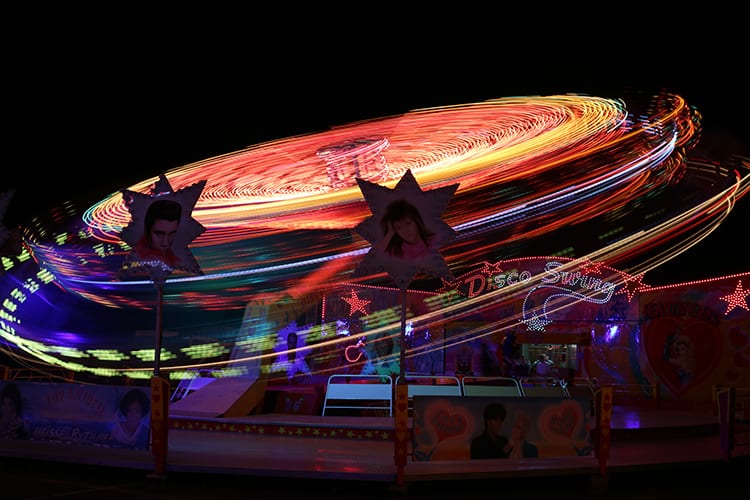 Auf Großereignissen wir Oktoberfest, Dom oder Wasen herrscht so viel Gedränge, dass es für Fotografen schwer ist, einen Standort zu finden, von dem aus man das ausgewählte Motiv gut ins Bild setzen kann, ohne angerempelt zu werden oder mit dem Stativ anderen Leuten im Weg zu sein. Die kleinen Frühjahrs- oder Kirchweihfeste bieten zwar weniger und nicht so spektakuläre Motive, aber man kann seine Bildideen besser umsetzen. Wenn es ein bisschen dauert, bis genug Vergnügungswillige zusammengekommen sind, damit das Karussell fährt, kann man einige Detailstudien betreiben. Eine leichte Minuskorrektur bringt die Farben leuchtender ins Bild, ein Graufilter verhilft zu längeren Verschlusszeiten und eine kleine Taschenlampe macht es möglich, auch bei wenig Umgebungslicht die richtigen Knöpfe und Schalter an der Kamera auf Anhieb zu finden. (Die passenden Städte zu den oben genannten Festen sind natürlich: München, Hamburg und Cannstadt).