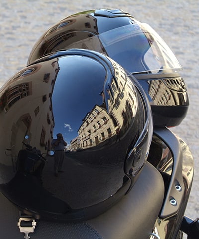 Wenn man die Fassaden zweier gegenüber liegender Häuser ein einem Bild zeigen möchte, tut man sich schwer – aber es geht. Man kann beispielsweise ein Fischauge einsetzen oder die Schwenkpanoramafunktion der Kamera nutzen. Man kann aber auch eine kugelig gewölbte spiegelnde Oberfläche fotografieren, in der, natürlich verzerrt, alles zu sehen ist, was sich davor und seitlich davon befindet. Dazu gehört dann auch der Fotograf. Natürlich können nicht nur polierte Helme als Spiegel dienen, sondern auch Motorhauben, geschwungene Windschutzscheiben und für Gartenaufnahmen die glänzenden Zierkugeln auf ihren dünnen, schwankenden Stangen.