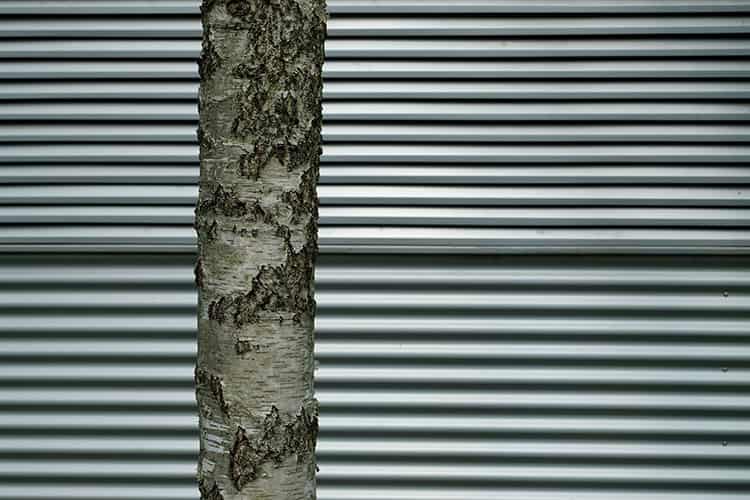Der Widerspruch zwischen Technik und Natur ist ein großes Motivgebiet. Man kann es von der „großen Seite“ her angehen und z. B. Kühltürme von Kraftwerken zeigen, neben denen Bäume klein und verloren wirken. Oder man nähert sich dem Motiv von der „kleinen Seite“ und setzt ins Bild, wie ein Löwenzahn den Asphalt durchbricht. Aber man muss gar nicht die Extreme wählen – ein Birkenstamm mit seinen unregelmäßigen Strukturen und eine geradlinige Blechjalousie tun es auch. Ein Blick auf die Wasserwaage in der Kamera hilft, späteres Korrigieren zu vermeiden. Wählt man bei der Aufnahme mit einem Zoom eine der mittleren Brennweiten, hat man gute Chancen, dass weder tonnen- noch kissenförmige Verzeichnung sichtbar werden. Aber natürlich spielen hier auch die Automatikkorrekturen per Firmware eine Rolle.