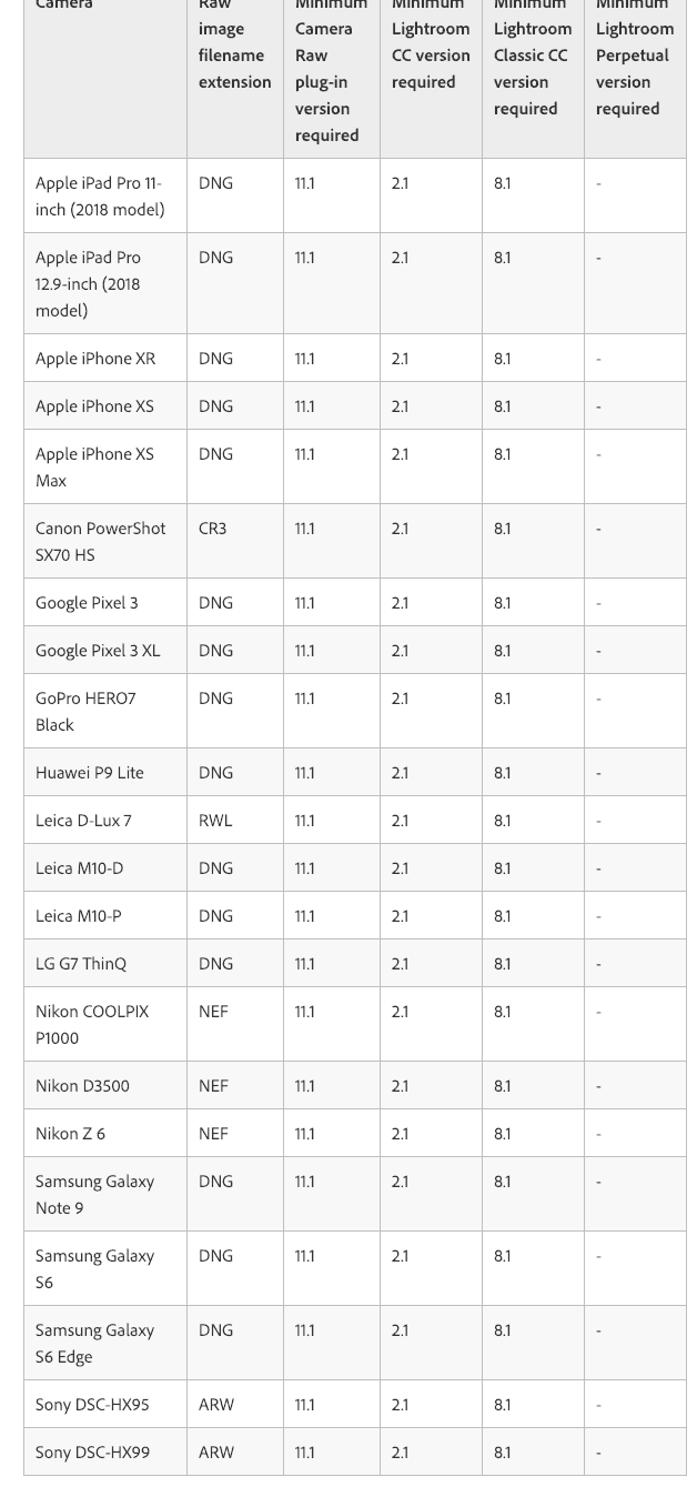 Hier eine Übersicht der ab sofort von Camera Raw unterstützten Modelle: