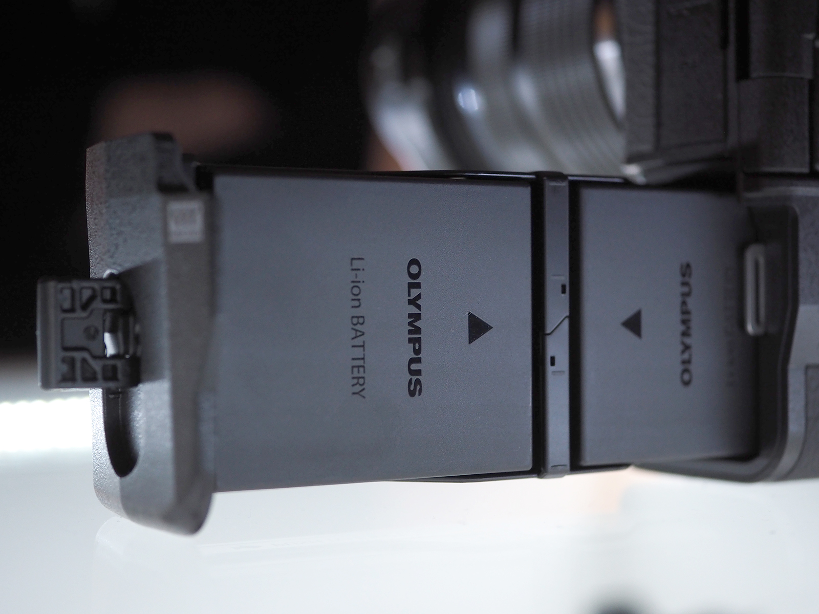 Im Griff finden zwei Akkus Platz. Zwei Pluspunkte: Beim Wechsel von einer E-M1 oder E-M1 Mark II können vorhandene Akkus weiterverwendet werden. Und es dauert nur zwei Stunden bis die Akkus wieder voll sind, wenn sie in der Kamera per USB-Anschluss (etwa von einer Powerbank) geladen werden.