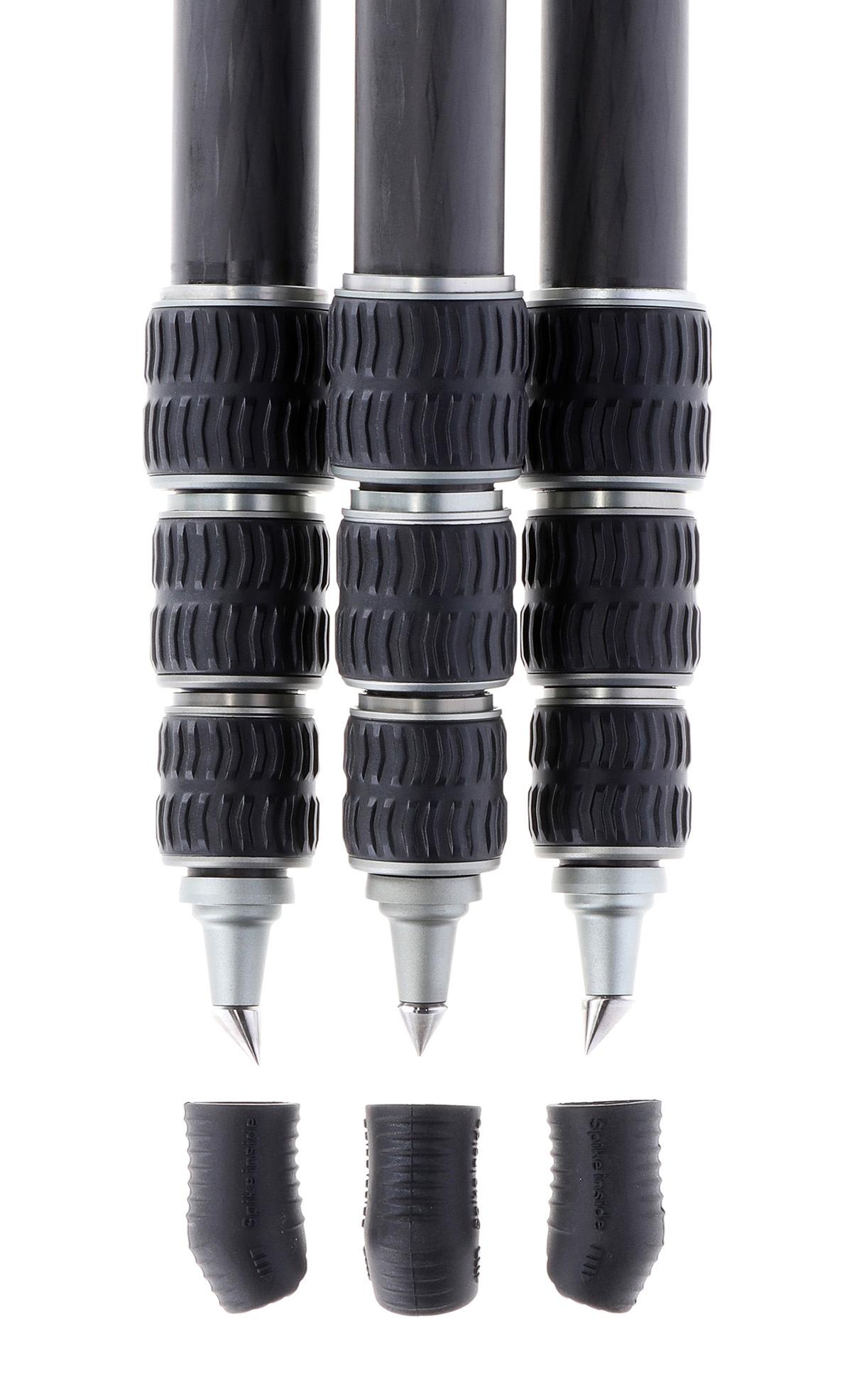 Besonders auf den Einsatz bei Outdooraufnahmen und auf unterschiedlichen Untergründen sind sie Spikes abgestimmt. Die Stahlspikes sind abgewinkelt und stehen daher senkrecht auf den meisten Untergründen. Wird das Stativ auf einem empfindlichen Boden aufgestellt, wie es bei Indoor-Aufnahmen meist der Fall ist, kommen die „Gummischuhe“ zum Einsatz, die schnell zu montieren sind.