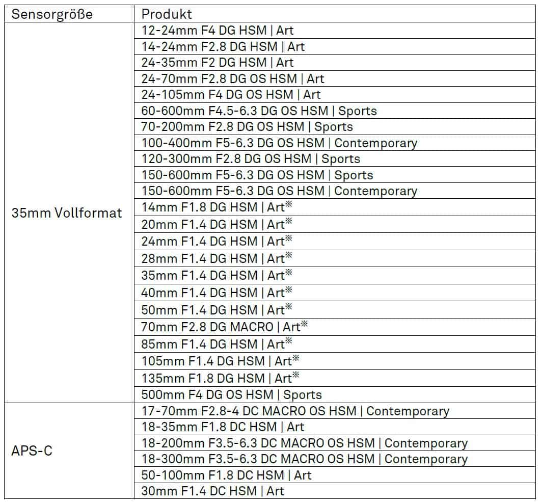 Mit dem Mount-Converter MC-21 sind 23 Vollformat-Objektive (mit DG-Kennung) und 6 Objektive für APS-S-Sensoren (mit DC-Kennung) kompatibel. Beim Einsatz der DC-Objektive sorgt die Auto-Crop-Funktion der Kameras für den richtigen Bildausschnitt.