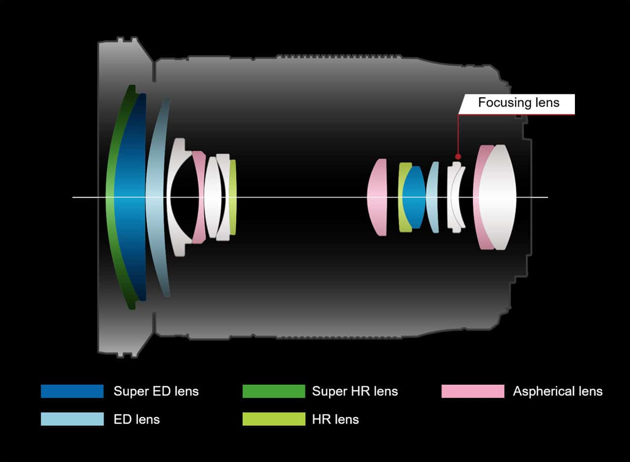 Diese Linse ist eine von 16, die in 11 Gruppen angeordnet sind. Um Abbildungsfehler zu minimieren setzt Olympus auf 3 Asphären sowie acht Elemente aus Gläsern mit besonderem Brechungs- oder Zerstreuungsverhalten. Dazu kommt eine spezielle Vergütung (ZERO = Zuiko Extra Low Reflection Optical) gegen Reflexionen und Geisterbilder.