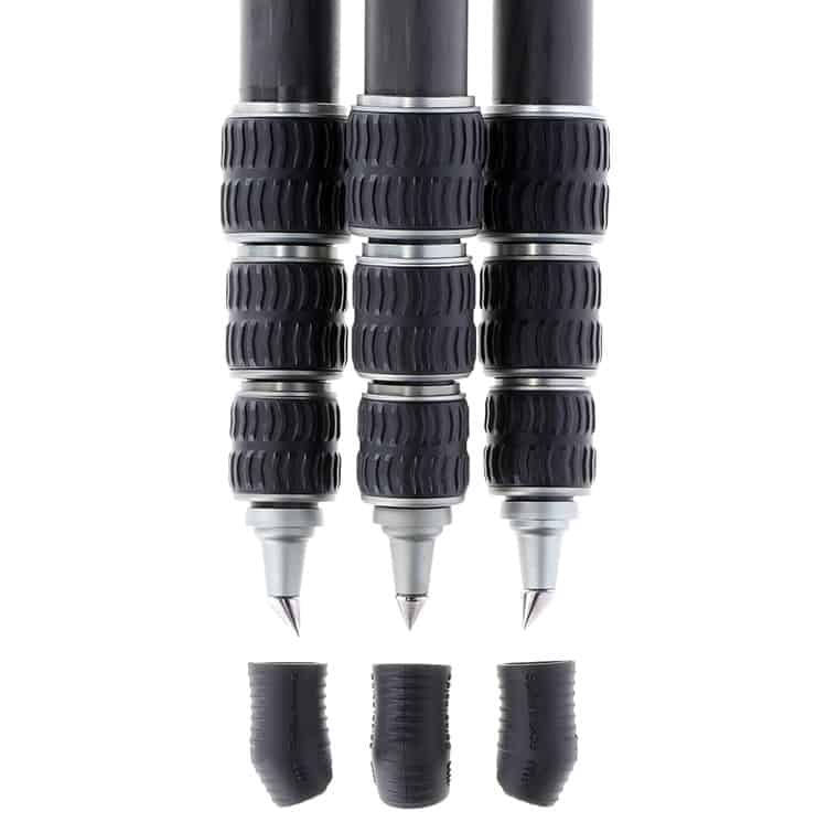 Bleiben wir bei den Beinen. Sie sind mit geknickten Spikes versehen, die immer (fast) senkrecht auf einen ebenen Untergrund treffen und für einen sicheren Stand des Stativs im Freien sorgen.