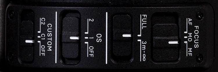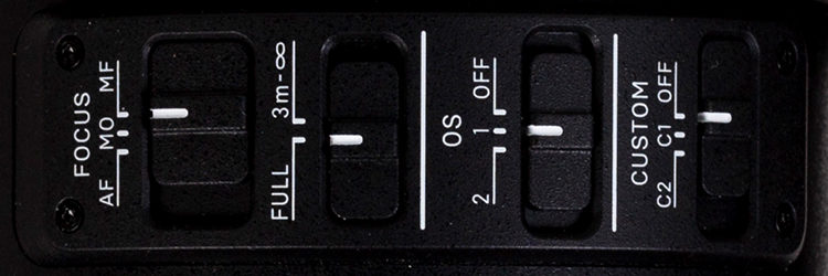 Dazu kommen zwei weitere Schalter: Zum einen zum Umschalten zwischen AF, MF und Manual Override und zum anderen für die Wahl zwischen zwei Modi für den Stabilisator (Standard/ Mitziehen).