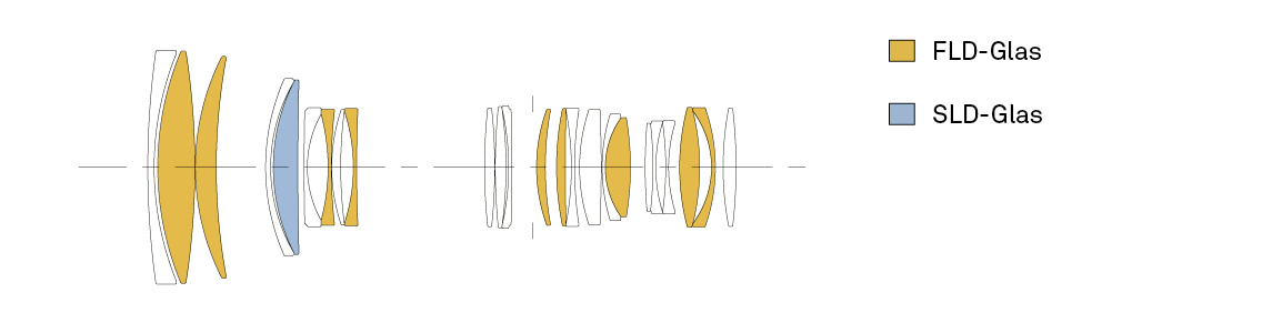 Dafür sorgen 24 Linsen in 22 Gruppen. Zum optischen Aufbau gehören 9 Linsen aus SLD-Glas und 1 mit einer Oberfläche, die von der Form eines Kugelsegments abweichen (Asphärische Linse).