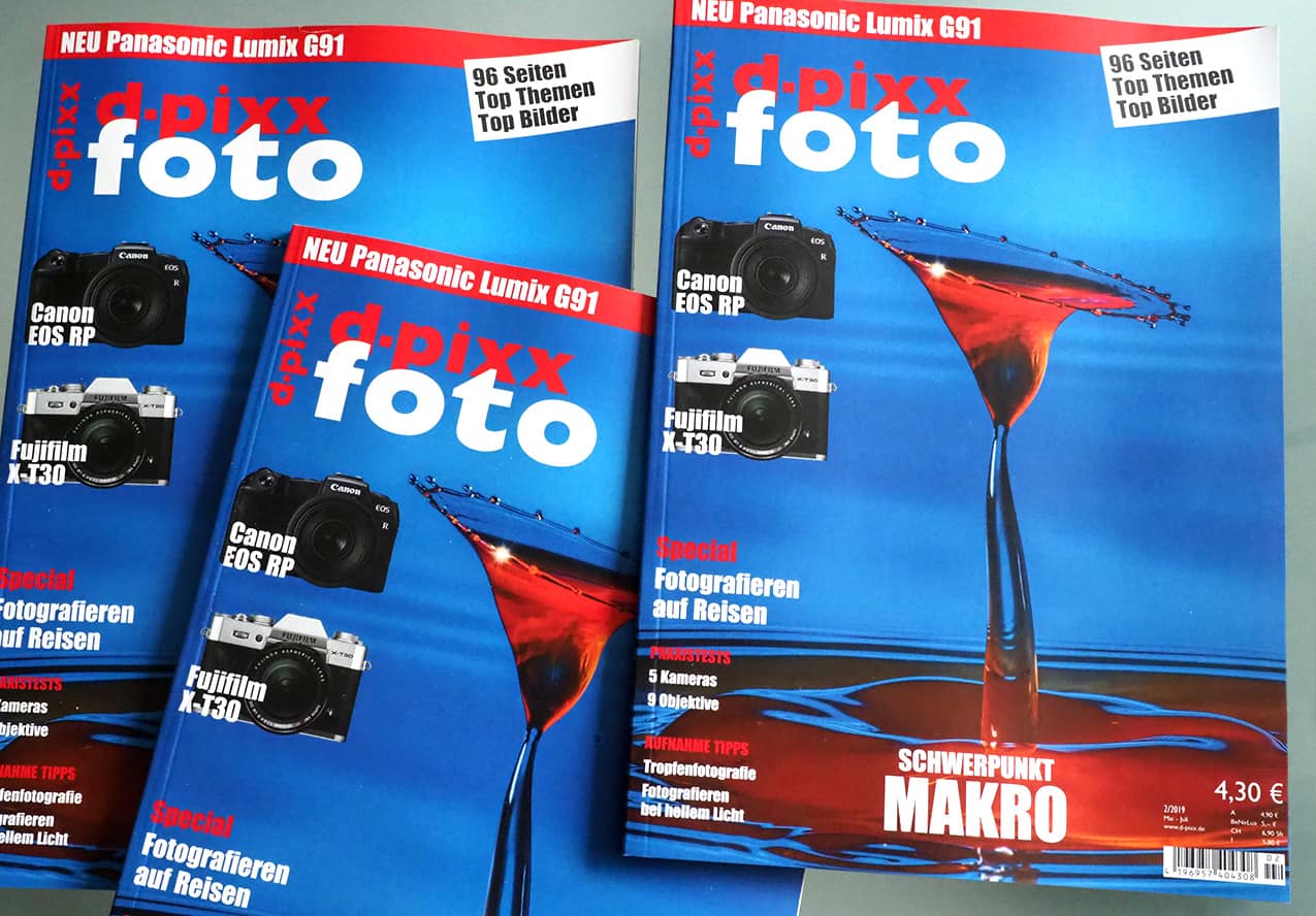 In Ausgabe 02/2019 liegt unser Themenschwerpunkt auf der Nah- und Makro-Fotografie. Wir geben verschiedenste Tipps, und zeigen wie aktuelle LED-Leuchten von Kaiser trotz kompakter Abmessungen eine ganze Menge Licht produzieren können. Ebenso werfen wir einen Blick auf Techniken wie Post-Fokus, Fokus-Bracketing und Fokus-Stacking. Beeindruckend ist darüber hinaus die Tropfen-Fotografie, wie sie auf unserem aktuellen Titel zusehen ist.