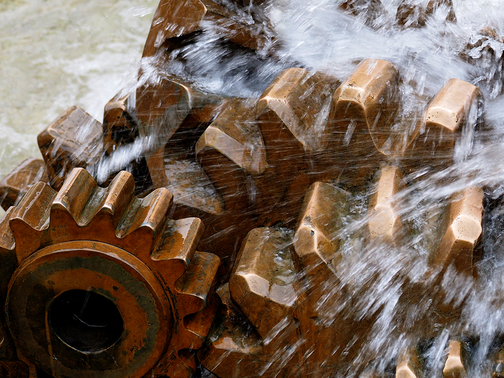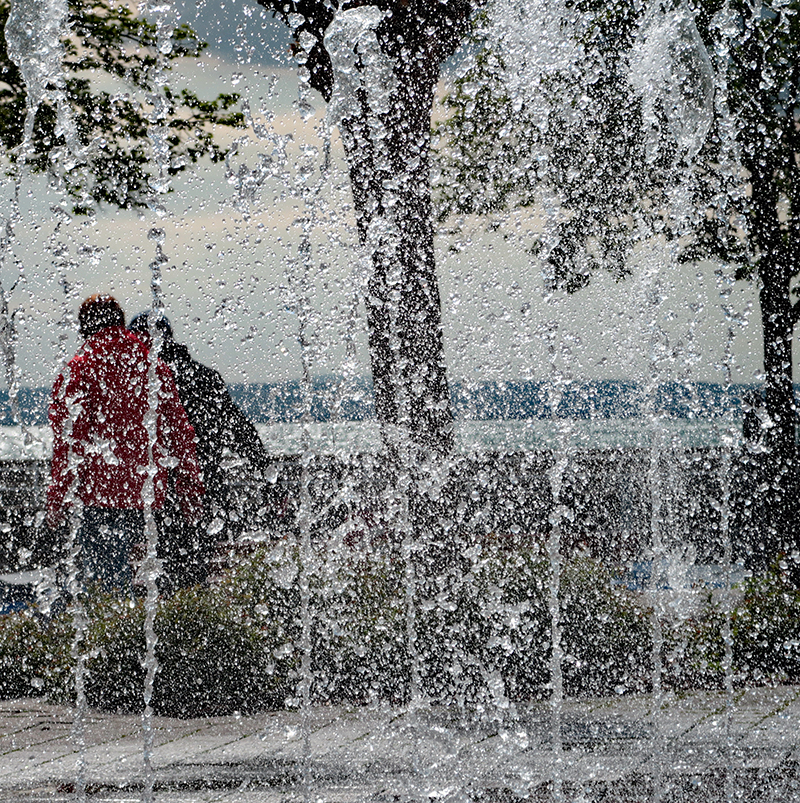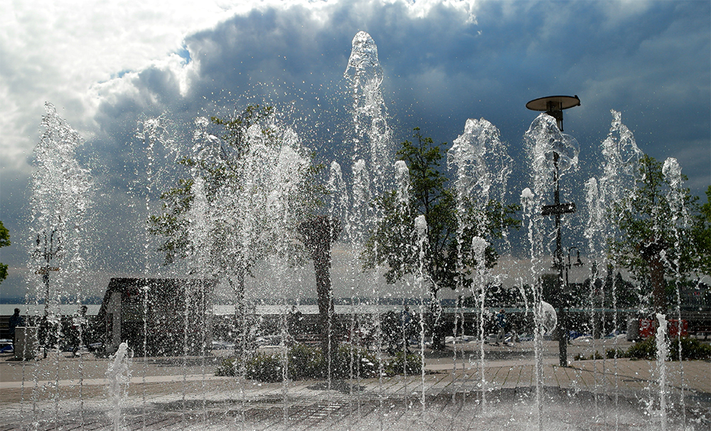 Der Weg führt vom Hotel Richtung See, der nur runde 200 Meter entfernt und eigentlich in ein paar Schlender-Minuten zu erreichen ist … eigentlich. Denn der Weg führt vorbei an einer Brunnen-Installation und schon ist ein erstes gemeinsames Motiv gefunden, das erkundet werden will.