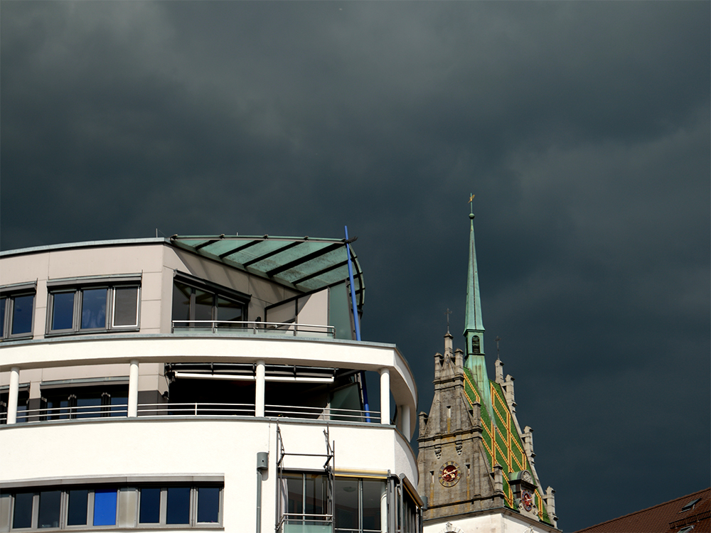 Das zweite gemeinsame Motiv sind die dunklen, die sehr dunklen Wolken, z. B. hinter dem Turm der Kirche Sankt Nikolaus, deren Turmdach durch ein Muster in den Ziegeln erst recht fotogen wird.
