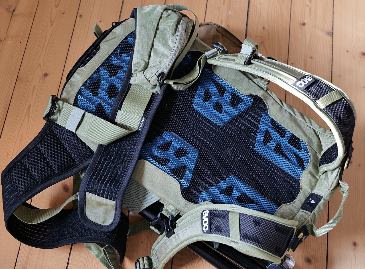 Das Tragesystem übernimmt Evoc von seinen Mountainbike-Rucksäcken, was eine gute Sache ist. Unter einer Mesh-Abdeckung sitzen gut sichtbar die fünf Polster des Airflow-Contact-System, das in der Praxis sehr gut funktioniert. Durch den vergleichsweise großen Abstand zum Rücken, ist es der Luft gut möglich zu zirkulieren. An dieser Stelle kann sich unser Testkandidat beispielsweise deutlich vom beliebten Everyday Backpack von Peak Design absetzen.