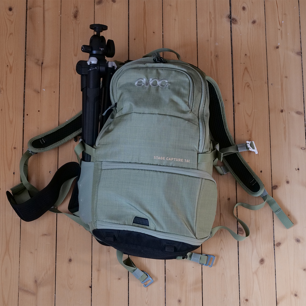 Anders herum sind umgewidmete Aktiv-Rucksäcke auch nicht immer die richtige Wahl, denn dort fehlen dann der Platz für ein Stativ oder zahlreiche kleine Fächer für Zubehör. All das möchte der Evoc Stage Capture 16l bieten und damit Kamera-affine Outdoor-Aktivsten glücklich machen. Im Portfolio der Münchner nimmt unser Testmuster die gemäßigte Rolle ein, denn grade für ambitionierte Bike-Fotografen, gibt es Modelle die noch stärker auf den Bike-Bereich zugeschnitten sind.