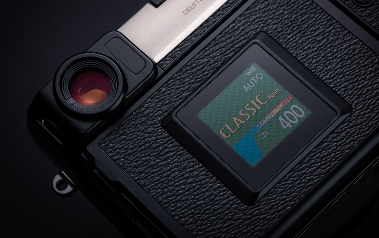 Auf der Rückwand fällt zunächst ein kleiner Statusmonitor (1,8“) auf. Er erinnert sehr an die kleinen Einschübe analoger Kameras, in die man den Deckel einer Filmschachtel steckte. Dann wusste man, welchen Film man eingelegt hatte. Und tatsächlich zeigt der kleine Monitor außer den aktuellen Aufnahmedaten auf Wunsch auch, welche Filmsimulation man eingestellt hat. Das ist eine nette Verbeugung vor der Vergangenheit.