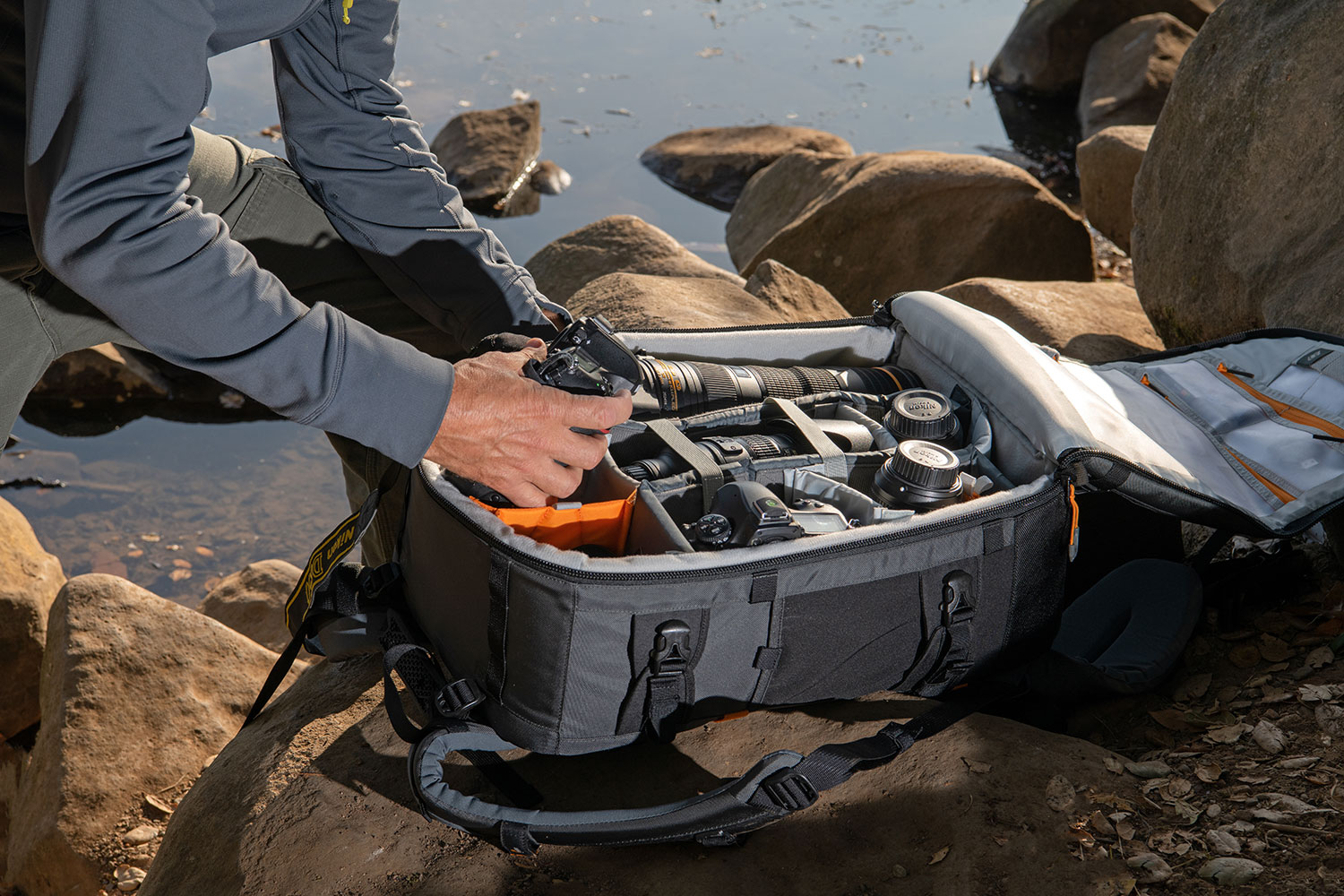 Der Pro Trekker BP 550 AW II eignet sich für Fotografen, die sich auf langen Foto-Touren nicht auf ein Minimum an Equipment beschränken möchten. Ein geringes Eigengewicht der Tasche ermöglicht die Mitnahme von mehr Zubehör. Bis zu drei Profi-DSLRs inklusive angesetztem 400-mm-Objektiv und eine Drohne finden im nur 3,65 Kilogramm schweren Rucksack Platz. Je nach Bedarf können Fotografen noch weitere vier bis sechs Objektive oder bis zu zwei Systemblitze sowie ein Profi-Stativ mitnehmen. Das größte Modell der Kollektion zeichnet sich außerdem durch eine abnehmbare Tasche mit einem Hauptfach und einer Zusatztasche für persönliche Gegenstände aus. Wer so viel Equipment auf dem Rücken trägt, muss sich bei Lowepro dennoch nicht um den Tragekomfort sorgen. Das ActivZone-Rückenteil bewirkt ein angenehmes Tragegefühl – den ganzen Tag lang. Der abnehmbare Hüftgurt unterstützt die richtige Gewichtsverteilung. Besonderer Clou: Trotz der Größe von 35 x 24 x 62 Zentimetern lässt sich der Pro Trekker BP 550 II in zwei handgepäcktaugliche Taschen aufteilen. Der Rucksack passt bei internationalen Flügen ins Handgepäckfach, die obere abnehmbare Tasche bequem unter den Vordersitz.