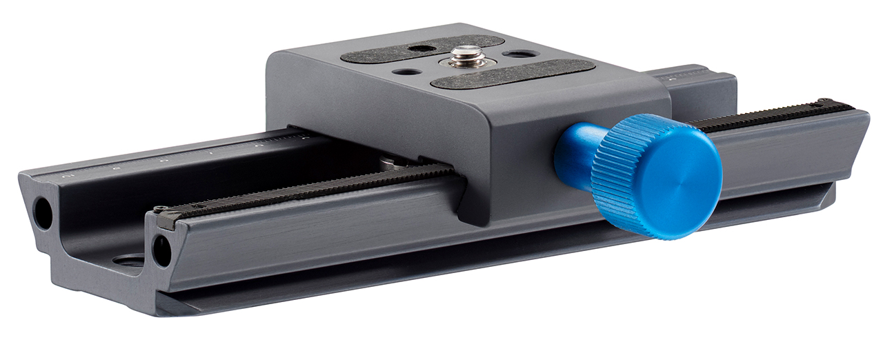 Der Einstellschlitten ist 14,5 cm lang. Der Kameraträger kann auf der Schiene in einem Bereich von 10 cm verschoben werden. Zusätzlich lässt sich die Schiene dank ihrer Schwalbenschwanz-Führung in einer Arca-Swiss-kompatiblen Schnellkupplungsaufnahme bewegen, so dass sich ein doppelter Verstellweg ergibt. Das heißt auch, dass der Einstellschlitten auf einer Vielzahl von Stativköpfen wie auch auf dem Reprostand Novoflex MS-Repro problemlos eingesetzt werden kann.