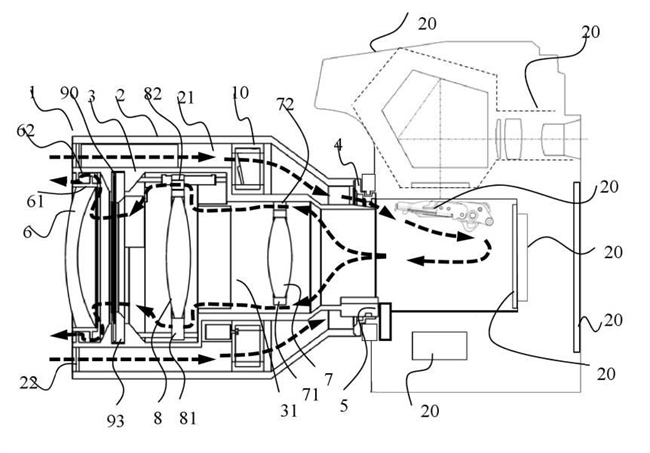 Wie auf der Patent-Skizze gut zu erkennen ist, integriert Canon zwei Zuluftkanäle an Ober- und Unterseite des Objektivs. Die Luft wird in Richtung Sensor geleitet und dann an den Linsenelementen vorbei wieder aus dem Objektiv befördert. Canon möchte auf diesem Weg einen Unterdruck erzeugen, sodass Staubpartikel gar nicht erst auf dem Sensor landen.