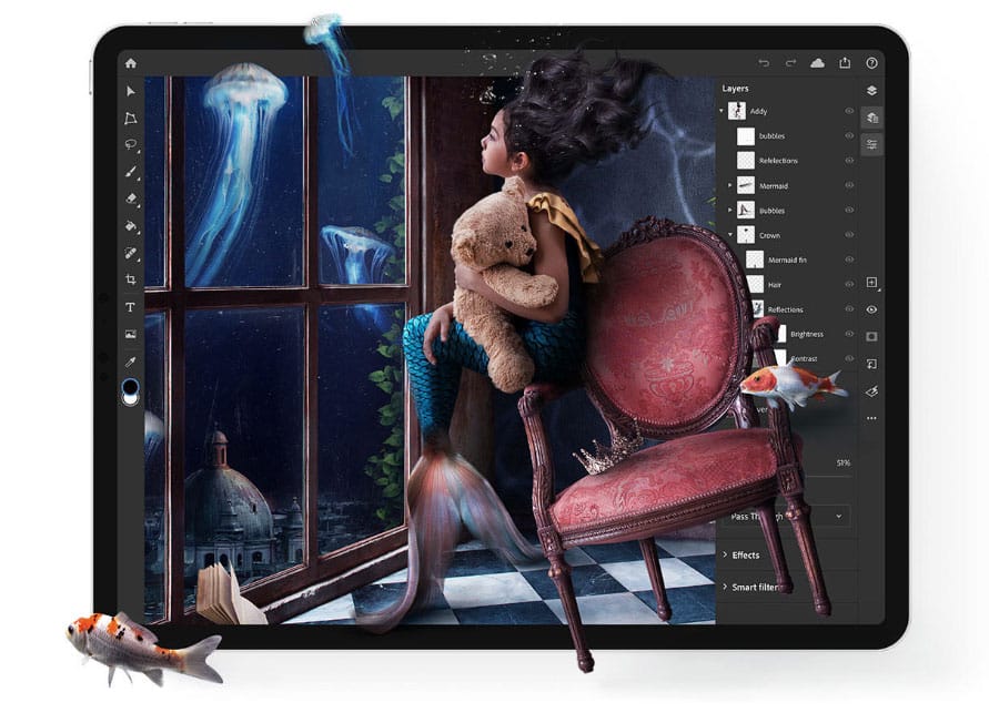 Adobe versprach vor einem Jahr, einen vollständigen Photoshop auf Apples Tablet-Lösung zu zaubern. Wie es jetzt aber aussieht, scheinen nicht alle Funktionen von den Amerikanern implementiert worden zu sein. Vielmehr bezieht sich die Aussage auf die Fähigkeit PSD-Dateien mit all ihren Informationen zu laden, die Desktop-Variante wird aber der Klassenprimus bleiben. Adobe selbst spricht von einer umfassenden Ergänzung zum Desktop-Programm. Passender weise hat Adobe den Fokus auf Kompositions- und Retouche-Features gelegt. Gleichzeitig wird aber versprochen, dass in Zukunft weitere Funktionen des Desktop-Version folgen sollen.