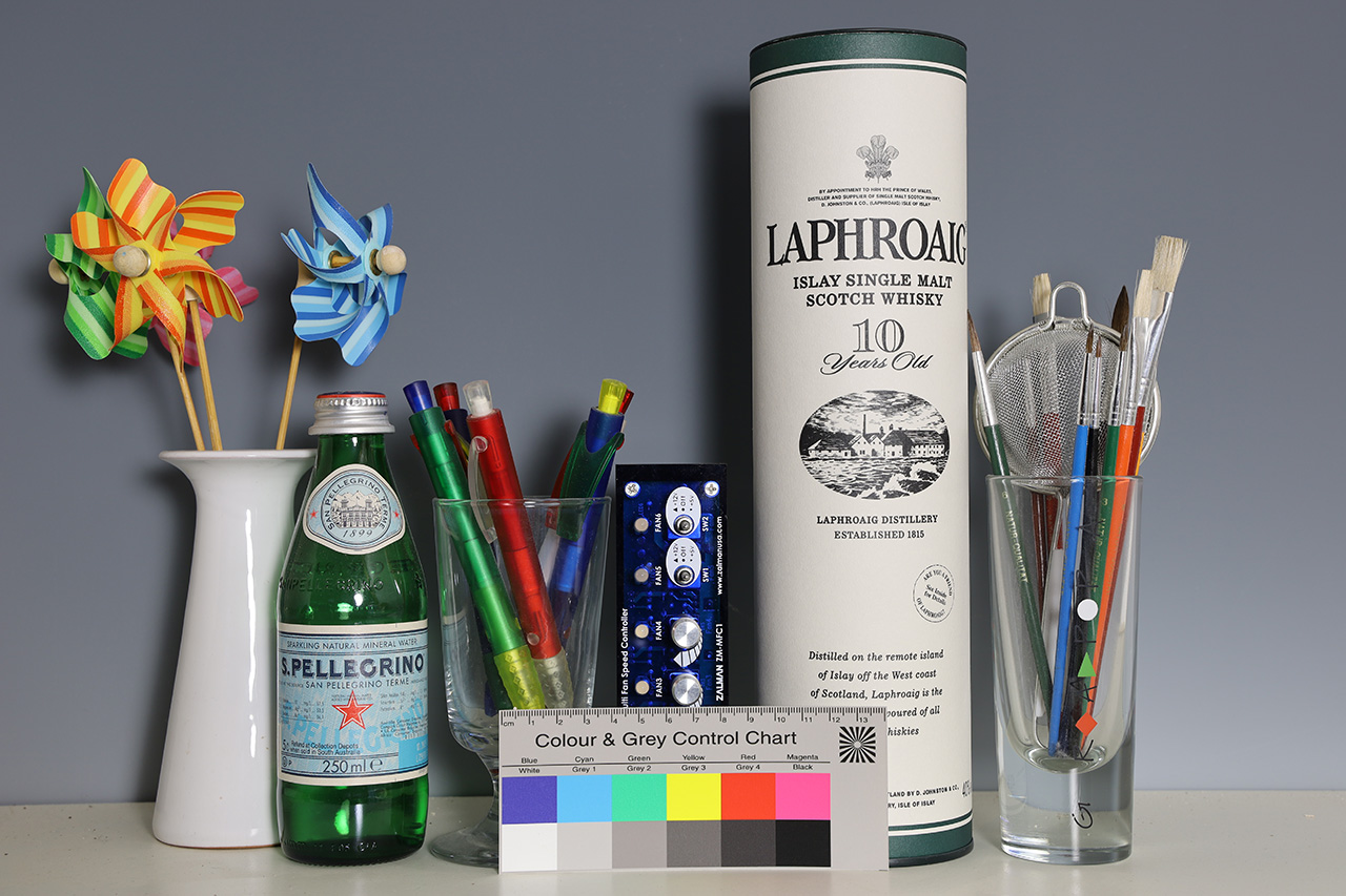 Das erste Bild zeigt den Aufbau im Studio, der wie immer mit einer Tageslicht-Fotoleuchte beleuchtet wurde. Die Helligkeit entspricht etwa EV 7.