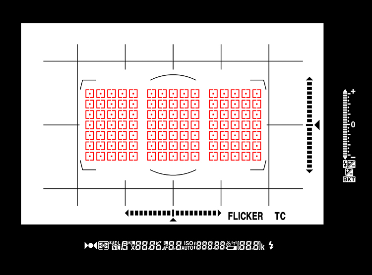 Alle 105 AF-Felder der D6 sind natürlich auf einem AF-Sensor im Boden des Spiegelkastens untergebracht (die D6 ist ja eine DSLR). Es sind nicht einfach nur Kreuzsensoren, sondern sie bieten jeweils 3 vertikale und 3 horizontale Zeilen.