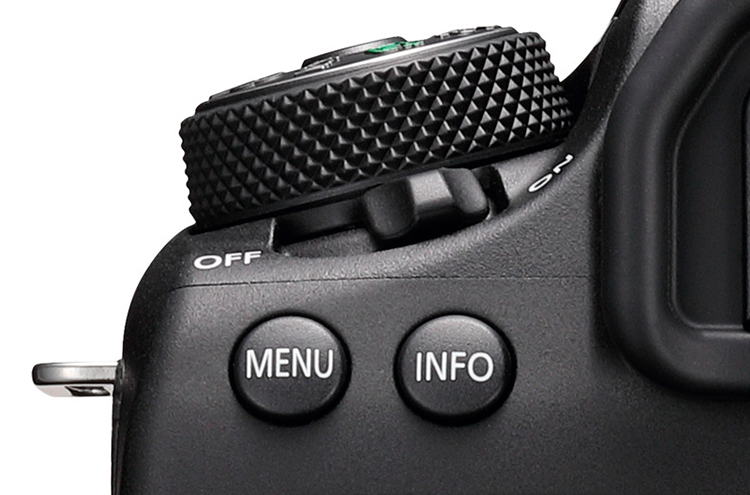 Der Hauptschalter liegt wieder links unter dem Betriebsartenwählrad. Für mich ist der Hauptschalter um den Auslöser zwar die bessere, weil schnellere Lösung … na gut. Das Rad muss zum Drehen entriegelt werden.
