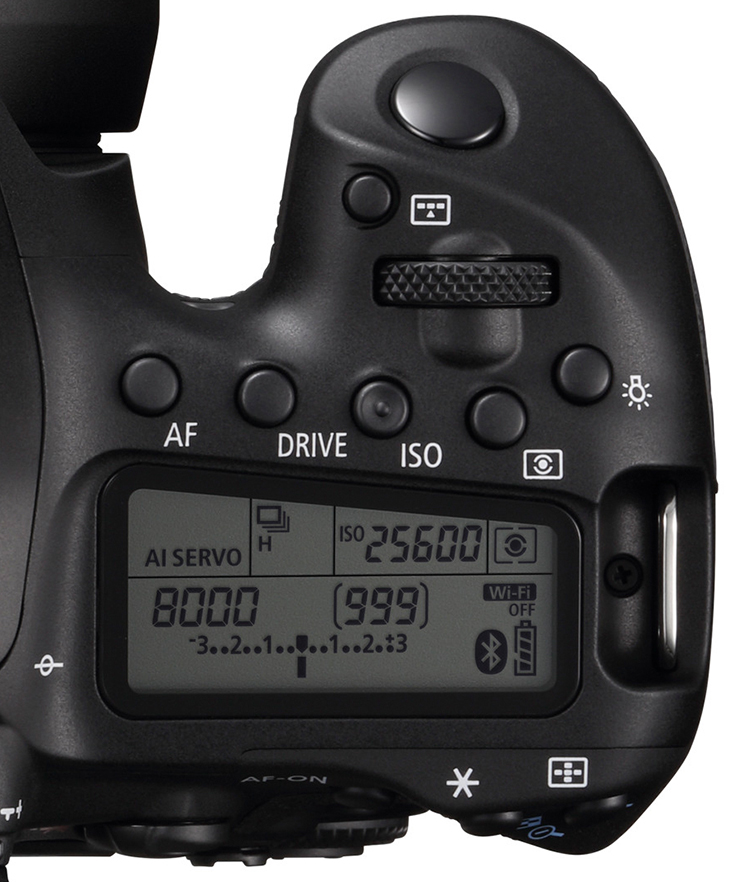 Rechts vom Sucher ist der Monochrom-Statusmonitor untergebracht, der beleuchtet werden kann. (Beleuchtbare Einstellelemente wären eine feine Sache, gibt es aber nicht. Sie sind aktuell der EOS-1D X Mark III vorbehalten, die gerade in der Entwicklung ist.)