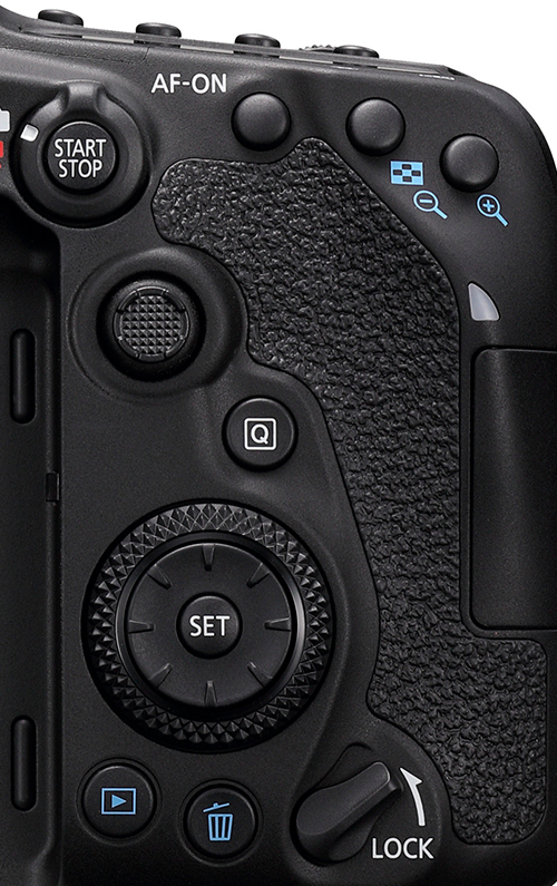 Davor die bekannten Tasten, mit denen man die Einstellungen für Autofokus, Bildfolge, ISO-Wert und Belichtungsmesscharakteristik aufruft. Dazu gesellt sich die Taste für die Beleuchtung des Statusmonitors, die schon auf dem Handgriff sitzt, wo man auch die Taste für die Einstellung des AF-Messfeldes (Einzelfeld, Gruppe, automatische Wahl) findet. Ebenfalls oben auf dem Handgriff: der Auslöser. Einen gesonderten Auslöser für Videos gibt es nicht. Diese Aufgabe übernimmt der Startknopf für den Live-View-Modus, wenn man den umgebenden Schalter vom Symbol Fotokamera auf das Symbol Videokamera gedreht hat.